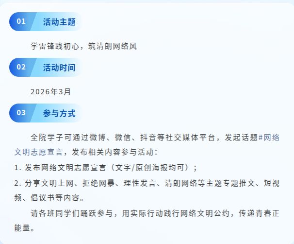 作为未来的小学教师,我们应以身作则,争做网络文明的传播者、守护者与践行者。接过雷锋精神接力棒,从指尖做起,让文明之花绽于网络,用志愿行动书写新时代小教学子的青春担当!快来参与活动,一起守护清朗网络,践行雷锋精神吧!