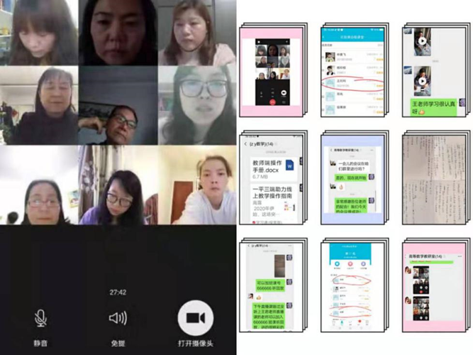 为深入响应并落实国家教育部关于“停课不停学”的号召,2020年2月12日晚18:00,咸阳职院基础部高等数学教研室就防控疫情期间关于线上教学——“蓝墨云班课”、“超星学习通”等多个平台的学习,通过微信群视频,举行了以2月6日至2月12日线上教学平台学习心得体会交流为主题的教研活动。基础部副主任王娟、教学办主任黄阿娜及高等数学教研室全体教师参加了讨论。