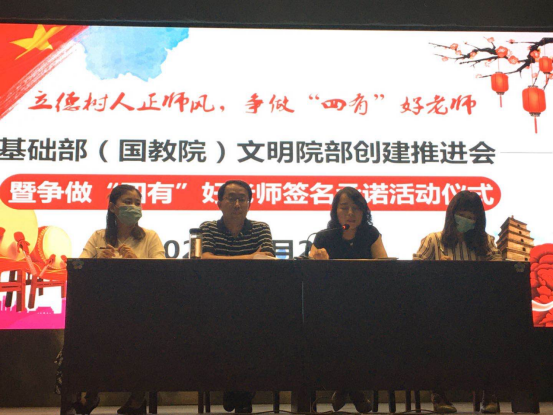 会上,基础部副主任王娟同志组织学习了《咸阳职业技术学院创建全国文明校园实施方案》和《咸阳职院2020年群众性精神文明创建活动实施方案》,英语教研室教师张宇同志作了题为《立德树人 做四有教师》的表态发言,门鹏锐老师代表全体教师宣读了立德树人正师风、争做“四有”好老师的公开承诺书。