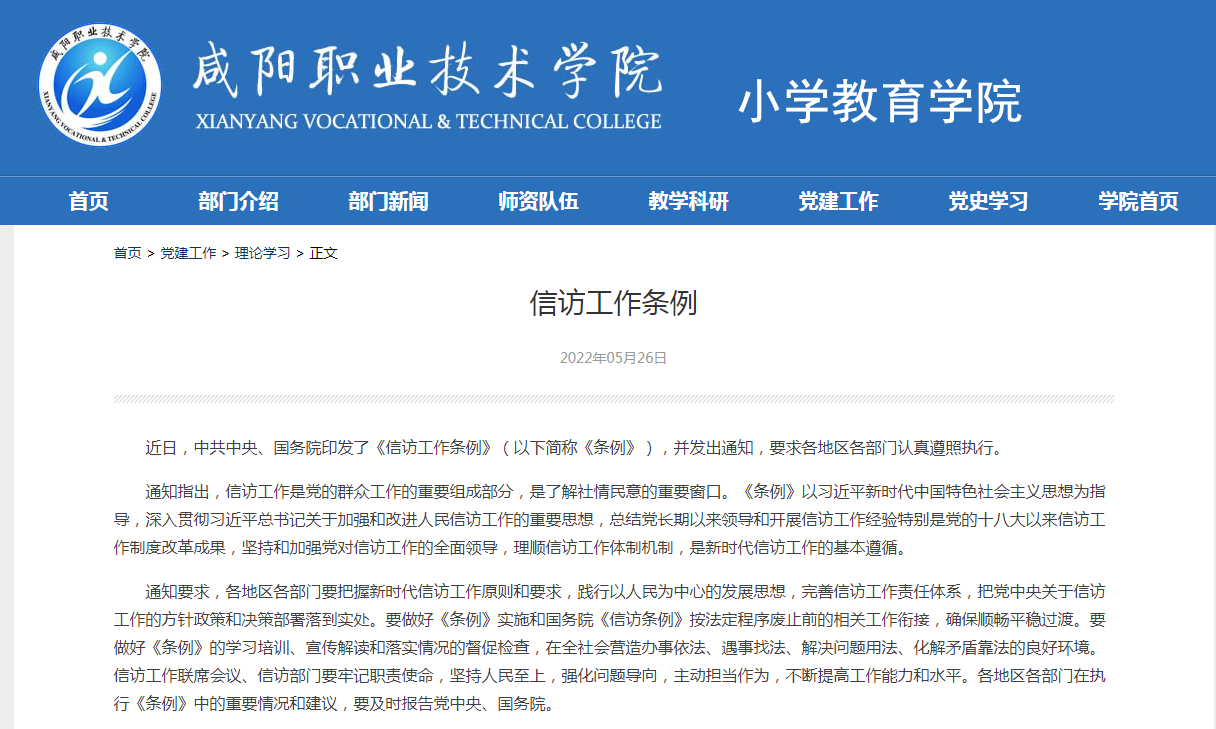 为深入领会学习习近平总书记关于加强和改进人民信访工作的重要思想,全面学习宣传贯彻落实《信访工作条例》,营造办事依法、遇事找法、解决问题用法、化解矛盾靠法的良好环境,贯彻落实信访工作新《条例》,坚持人民信访为人民,5月26日,小学教育学院通过部门门户网站、微信公众号等多种方式积极营造《条例》宣传的良好氛围。