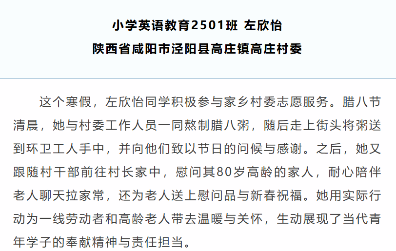 寒假启幕不止有欢聚出游,小教学子步履不停奔赴家乡投身实,践以青春足迹丈量乡土温暖。本次集结学院4位志愿者代表,一同聆听他们的实践故事,感受新时代学子的青春风采。